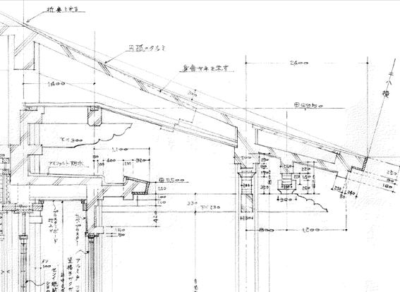 原寸作業を進めるに当たっては、まず、「原寸施工図」が書かれます。原寸作業を進めた後で、大きな手直しが無い様に、設計図に基づいて描かれます。この段階で縮尺1/50~1/20ぐらいで立面図に軒反りや屋垂みの詳細が描かれ、細部と全体のバランス、納まり等、設計図で表現できなかったものが、原寸作業技術者と設計者を交えて決定されていきます。