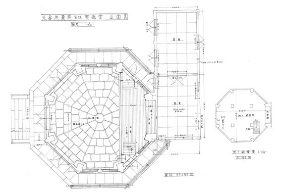 珍しい九角をした九角如来堂/「九」は教祖と縁の深い数字とのこと/右は立面図 |
