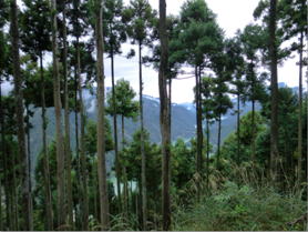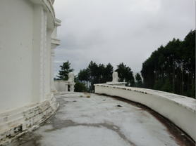 この仏舎利塔は東京都奥多摩町留浦と山梨県小菅村・丹波村との県境にある大寺山山頂にある。訪れるには写真のように登山客が登るような山道を行かなければならない。登り始めて約1時間で木々の隙間に山頂の白い建物が目に入ってくる。 |
