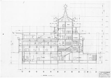 一階から二階までの外部に縦の線を通し、形としては一階分に見立てて、その上に面積をやや縮小した三階、四階をのせ、さらにその上に小さい塔屋を建てて宝珠、水煙を挙げて寺院建築の雰囲気を出している