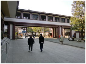 連絡路の回廊も軒を出し、軒下を日本建築風に取扱って、周囲との調和に努めた。