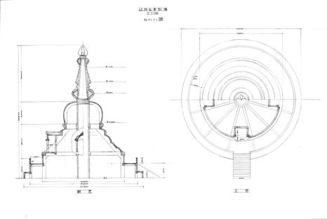 臼杵仏舎利塔は臼杵市の諏訪山に所在する。大岡實が仏舎利塔の原始形式における全体の形を確実に知りうるとして、仏舎利塔のデザインのモチーフにしたストゥーパの四種の資料からすると、このデザインはいずれのものにもはてはまらないもので王舎城仏舎利塔が建設された多宝山出土の小仏舎利塔(基礎工事中に出土したのかもしれない)をモチーフにしたと思われる特異なデザインとなっている。このスタイルの仏舎利塔作品は後の金沢仏舎利塔があるのみである。 |