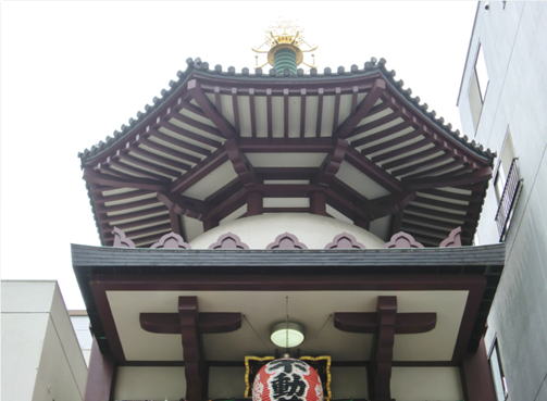 この薬研堀不動院は「大岡實建築研究所作品目録」では「川崎大師平間寺別院本堂」とされている。この建物は多宝塔形式をモチーフにしたデザインとなっており、仏舎利塔の作品の中にも宝塔形式や多宝塔形式のものがあり、その共通性にも関心が寄せられる。 |